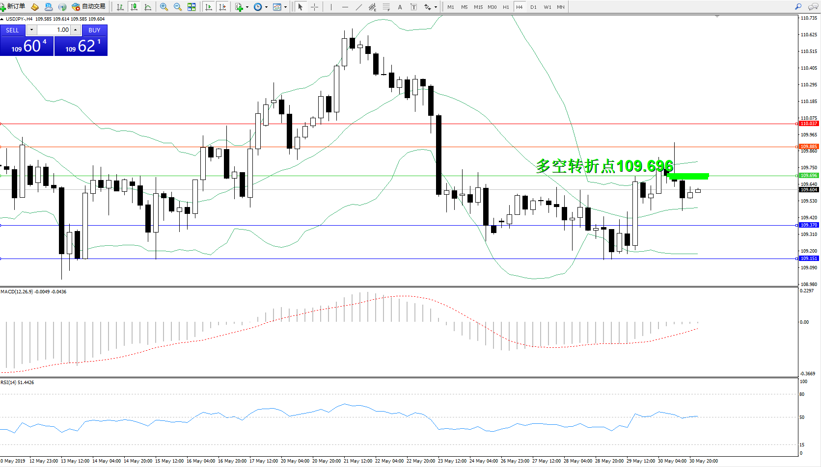 交易策略:109.696下方看跌,目标109.370、109.151