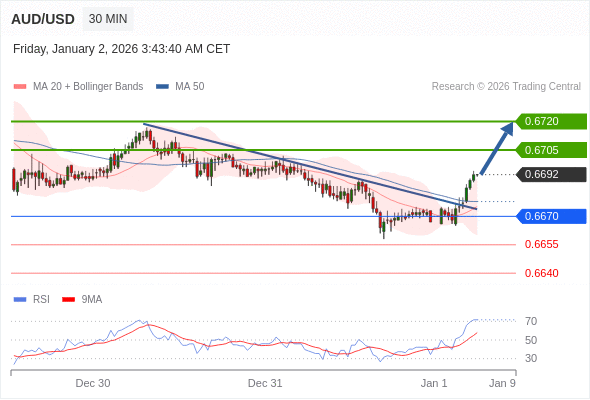 在 0.6670 之上,看涨,目标价位为 0.6705 ,然后为 0.6720 。