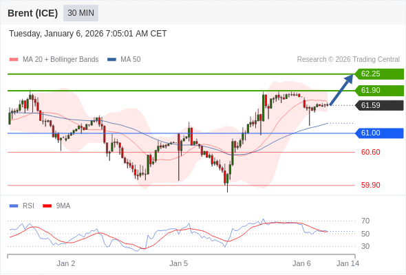 布伦特原油 (ICE) (H6) 当日内: 在61.00之上,看涨。
