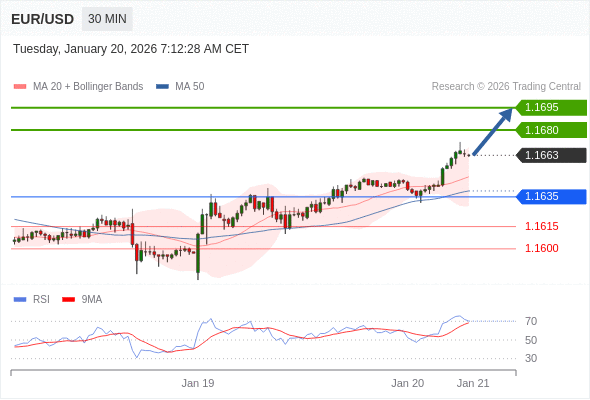 在 1.1635 之上,看涨,目标价位为 1.1680 ,然后为 1.1695 。