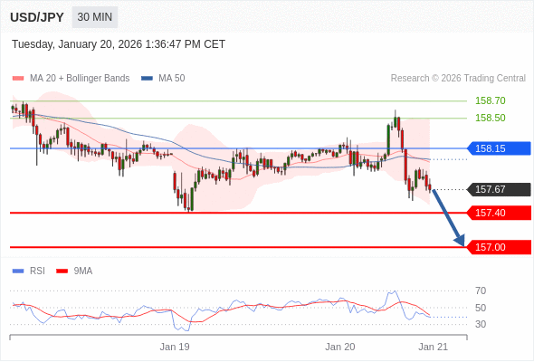在 158.15 之下,看跌,目标价位为 157.40 ,然后为 157.00 。