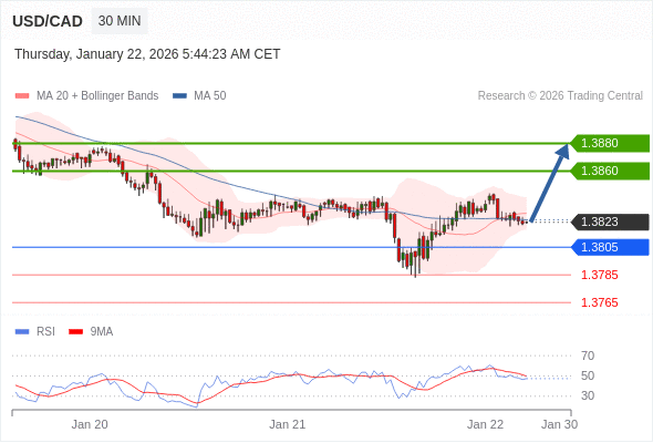 在 1.3805 之上,看涨,目标价位为 1.3860 ,然后为 1.3880 。