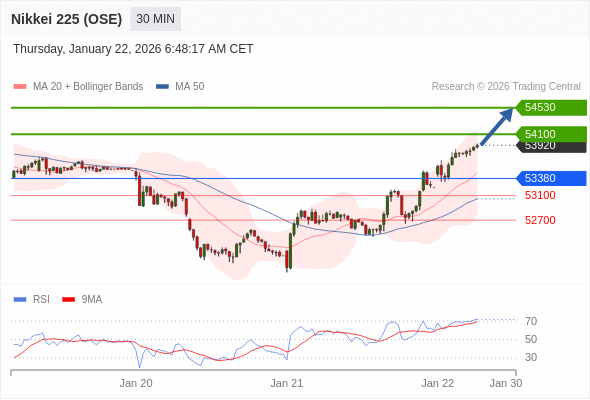 在 53380 之上,看涨,目标价位为 54100 ,然后为 54530 。