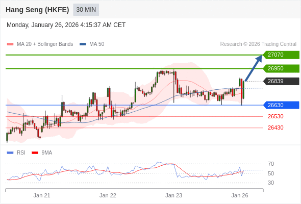 在 26630 之上,看涨,目标价位为 26950 ,然后为 27070 。