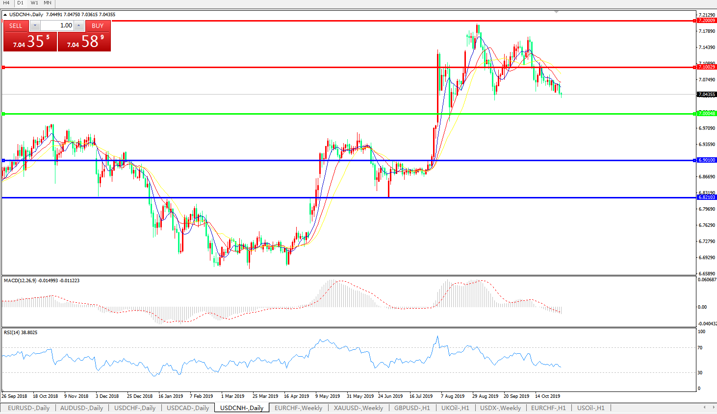 技术面简析:日图短期均线呈空头排列,汇价缓步走低,MACD下穿0轴且量能0轴下方小幅放量,RSI持续小幅走低,预计短期汇价大概率将进一步下行,汇价持续运行于7.00-7.10区间的概率较大;关注中美贸易谈判最新进展。