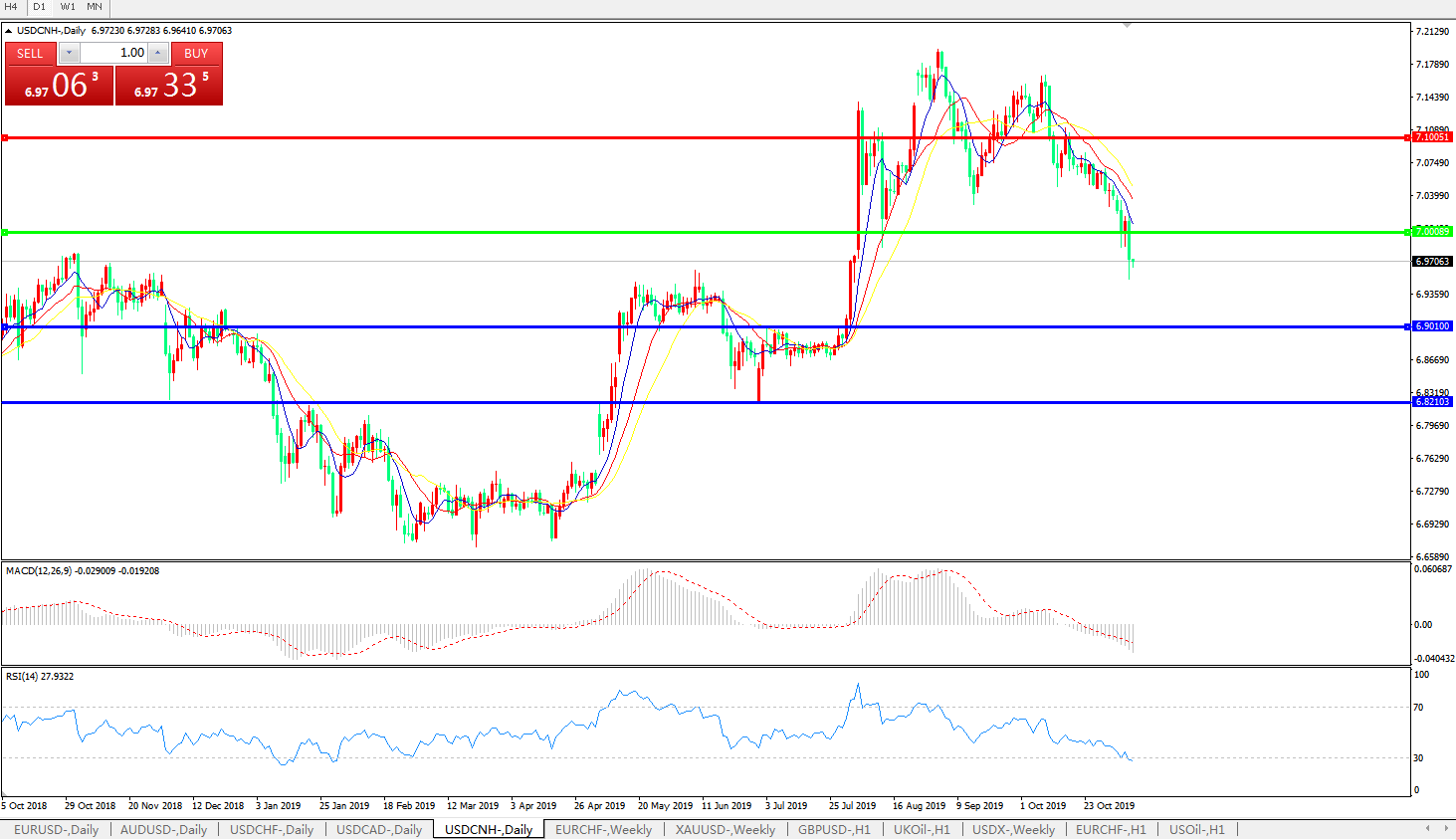 技术面简析:日图均线呈空头排列,汇价迅速跌穿7.0整数关口,MACD运行于0轴下方且量能0轴下方加速放量,RSI持续走跌跌入超卖区域,预计汇价有进一步走低的空间。