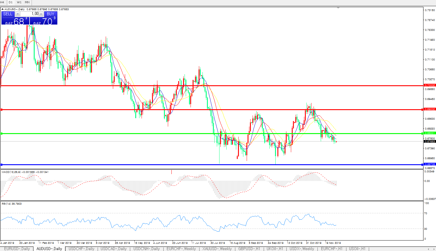 澳元兑美元在周四早盘受澳洲经济数据继续低迷影响跳跌至10月17日以来的新低0.6759,此后虽一度试图挣扎反弹,但无奈空头仍掌握行情主动权,这使得澳元过去四周以来的下行趋势变得更加难以扭转; 日内数据显示澳洲私营经济投资力度不振,这是继此前该国就业意外下行后再度传出的经济负面信号,虽然,投资者仍认为澳洲联储下周降息概率不大,但是其明年2月下一次会议强化宽松的预期却因此进一步上升,因此澳元汇价承压格局不变。而日内全球贸易环境前景再添变数之状况,也料令对此高度敏感的澳元汇价更受打击;眼下,澳元兑美元反弹空间已经受到10日均线(切入位在0.6794)的强力压制,而下方初步支撑在0.6740,跌破后即将下探10月16日的低点0.6724。考虑到近期美元指数持续坚挺,在美国感恩节假期结束之前,澳元下行压力仍将持续存在。