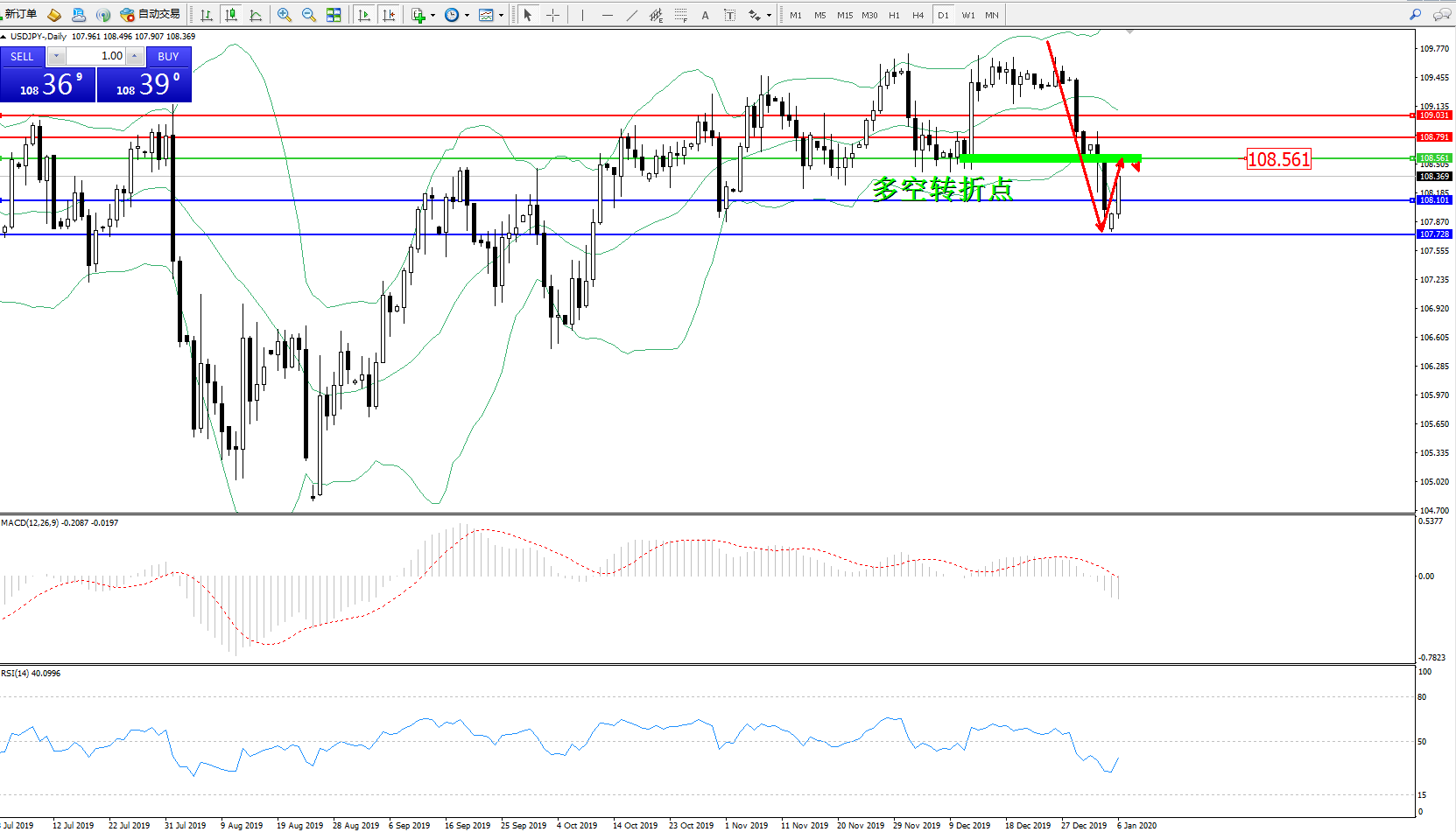 交易策略:108.561下方看跌,目标108.101、107.728