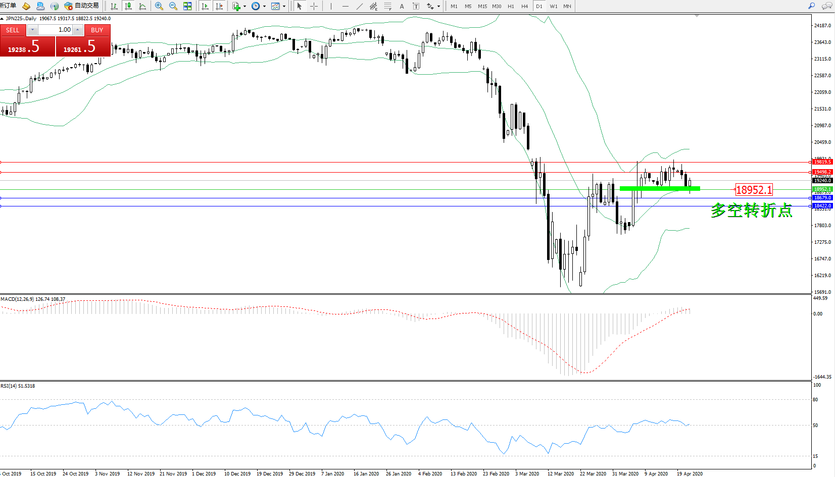 日经225指数4月22日(周三)收盘下跌153.78点,跌幅0.80%,报19127.00点。近期疫情仍在继续恶化,油市的暴跌引发整个金融市场恐慌,全球经济解除封锁的困难重重,尽管股市近期下行压力较大,市场短期风险仍然居高不下,且疫情将导致2020年盈利受损,但能源转型企业的长期价值和潜力并没有实质性的改变,因此股市这波跌势不太可能创出新低。日本财务大臣麻生太郎称:现在不是政府出售日本政策投资银行(DBJ)股票的时机。需要观察新冠病毒对地区银行的影响。地区银行资本充足率仍适宜。