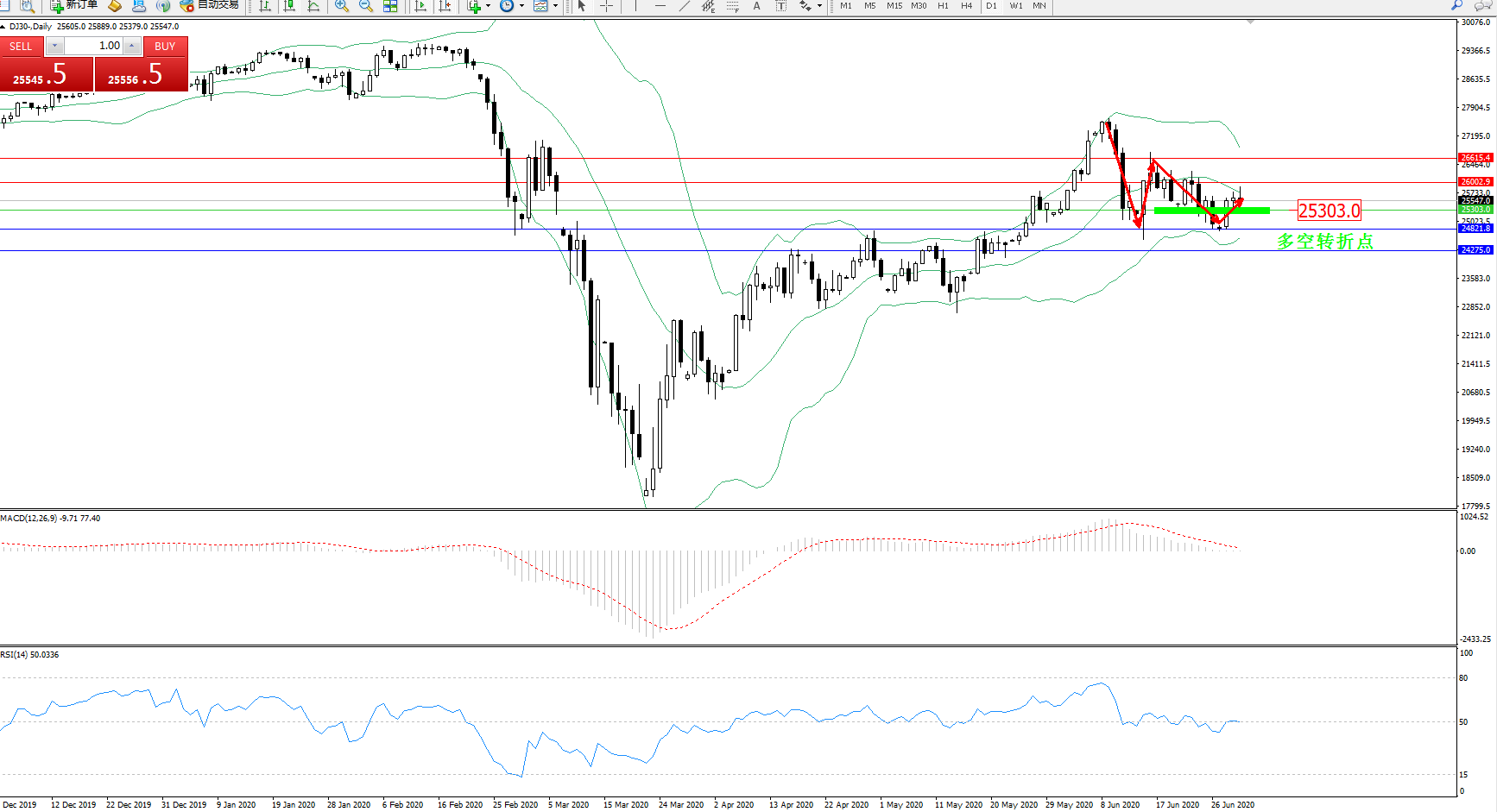 交易策略:25303上方看涨,目标26002、26615