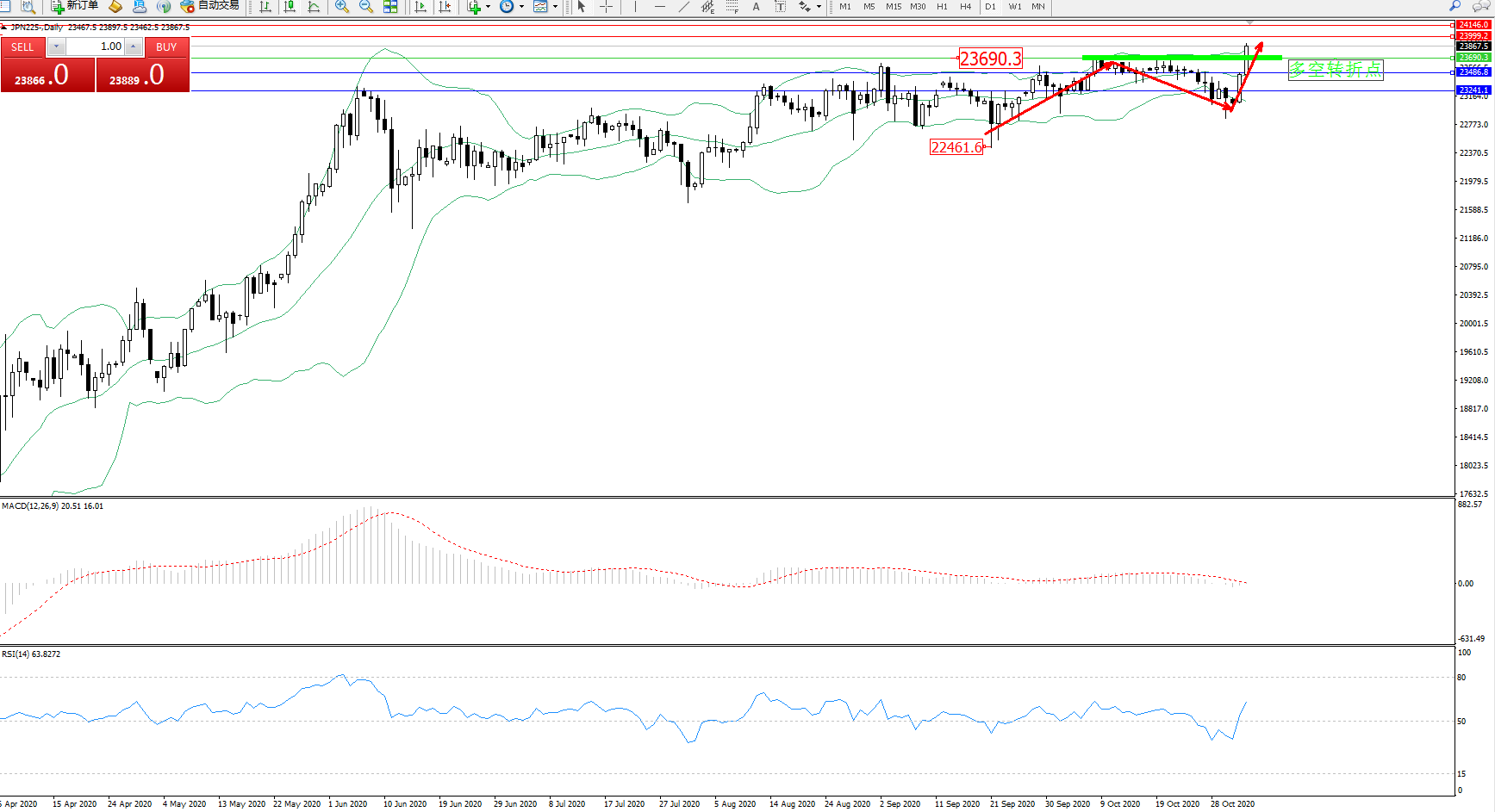 日经225指数11月2日(周一)收盘上涨324.37点,涨幅1.41%,报23301.50点。日本政府宣布,从11月1日起,从中国(含台湾、香港、澳门)进入日本的人,不再需要在日本的机场接受核酸检测。市场整体因美国大选的动荡而风险偏好下降,美国总统大选竞争激烈的前景,美股三大指数期货短线走高,道指期货、标普500指数期货均涨超0.5%,纳指期货现涨0.73%。日本首相菅义伟:将视需要对交通运输企业提供支持。未考虑下调消费税,这是用于社会保障基金的资金。经济形势依然严峻,但出现复苏迹象。将毫不犹豫采取必要措施。日本首相菅义伟拒绝就第三份额外预算的新内容置评。美联储会在长时间内将名义利率维持在低水平,因此实际利率的表现还要看通胀。今年年末至明年全球经济的复苏或加速,通胀预计将升温。这一次的美国大选从某种程度上说转移了市场注意力,因此本周会有所波动。市场显然有很多不确定性,但最终而言,这些震荡都将是暂时的,不会改变长期趋势,也就是实际利率的低迷。