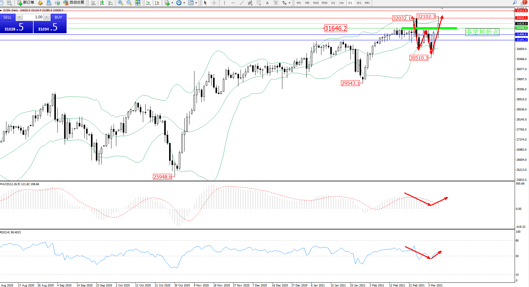 交易策略:31646上方看涨,目标32032、32312