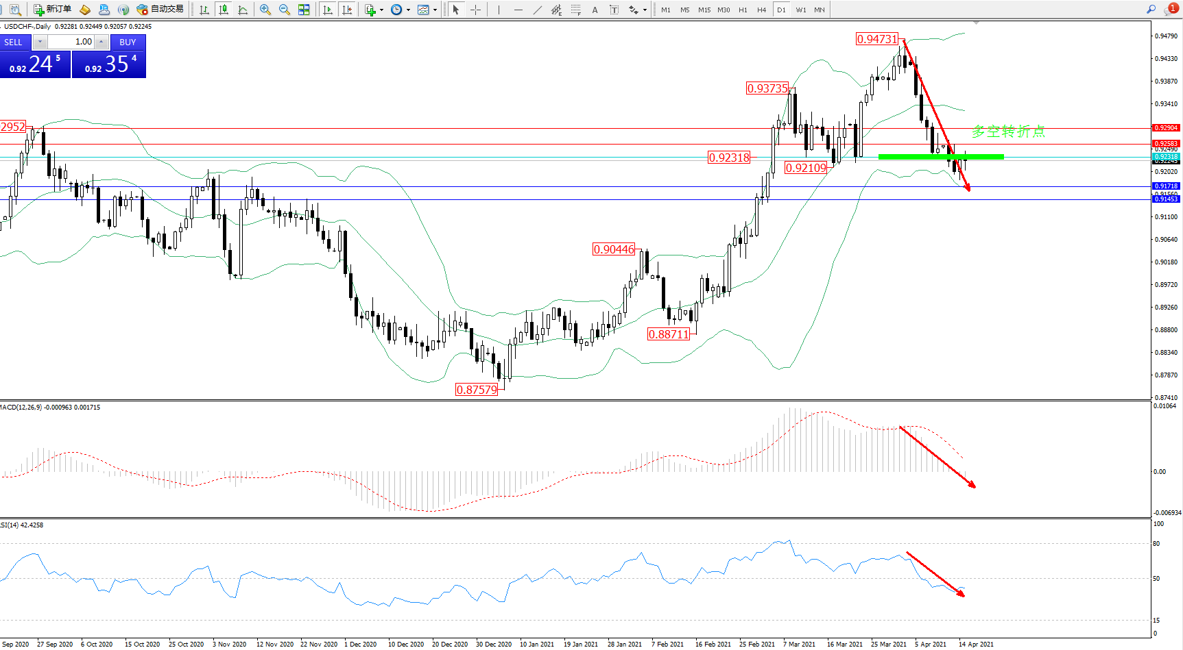 交易策略:0.92318下方看跌,目标0.91718、0.91453