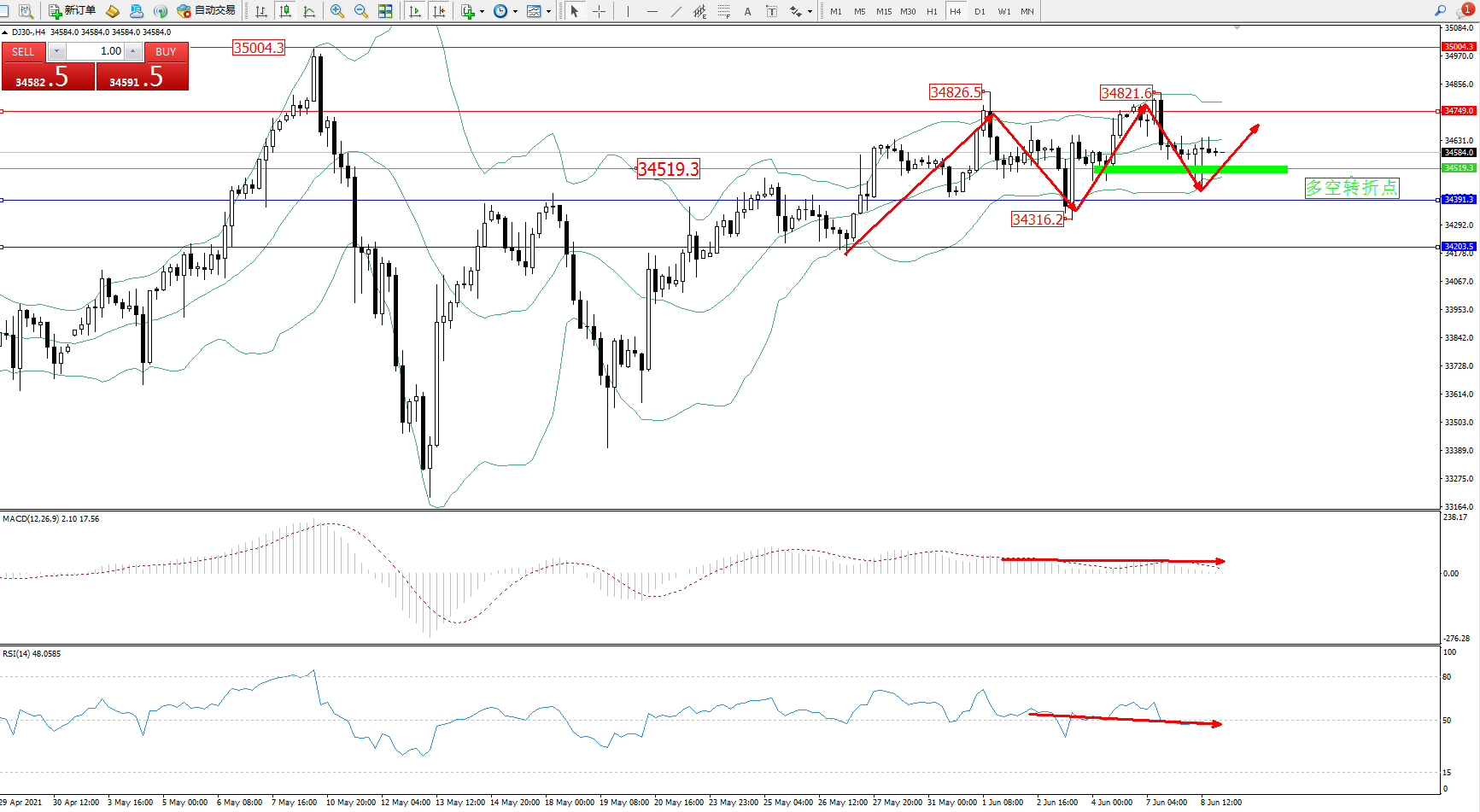 交易策略:34519上方看涨,目标34749、35004