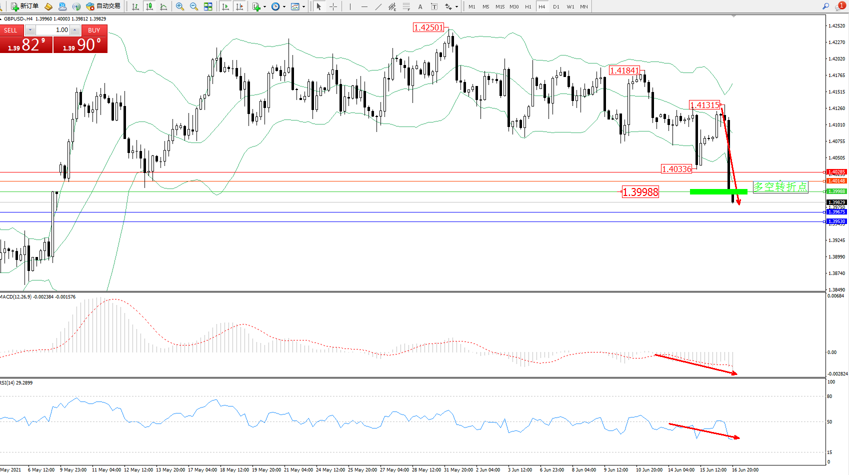 交易策略:1.39988下方看跌,目标1.39675、1.39530