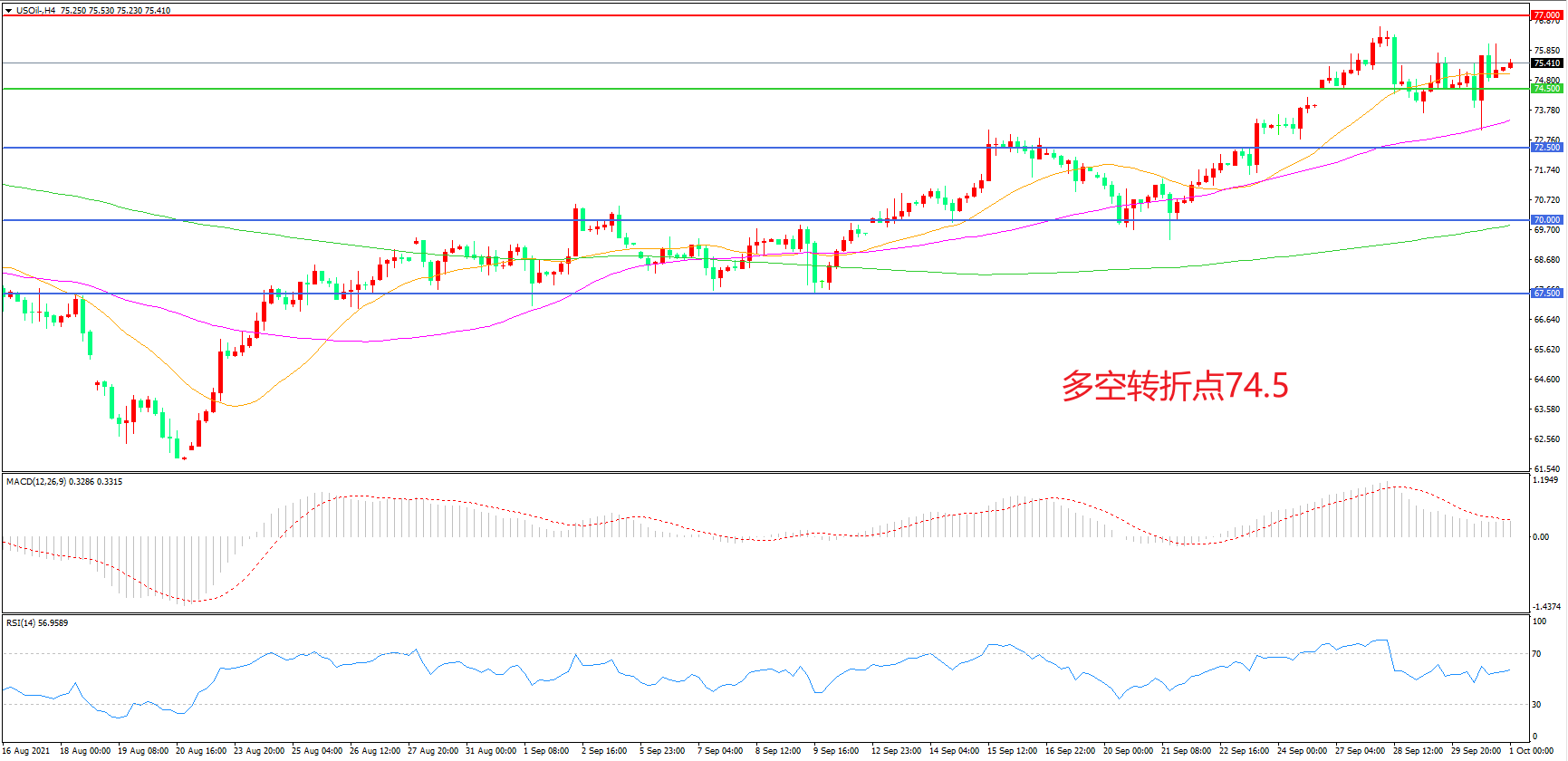 交易策略:在74.50之上看涨,目标77.00 80.00