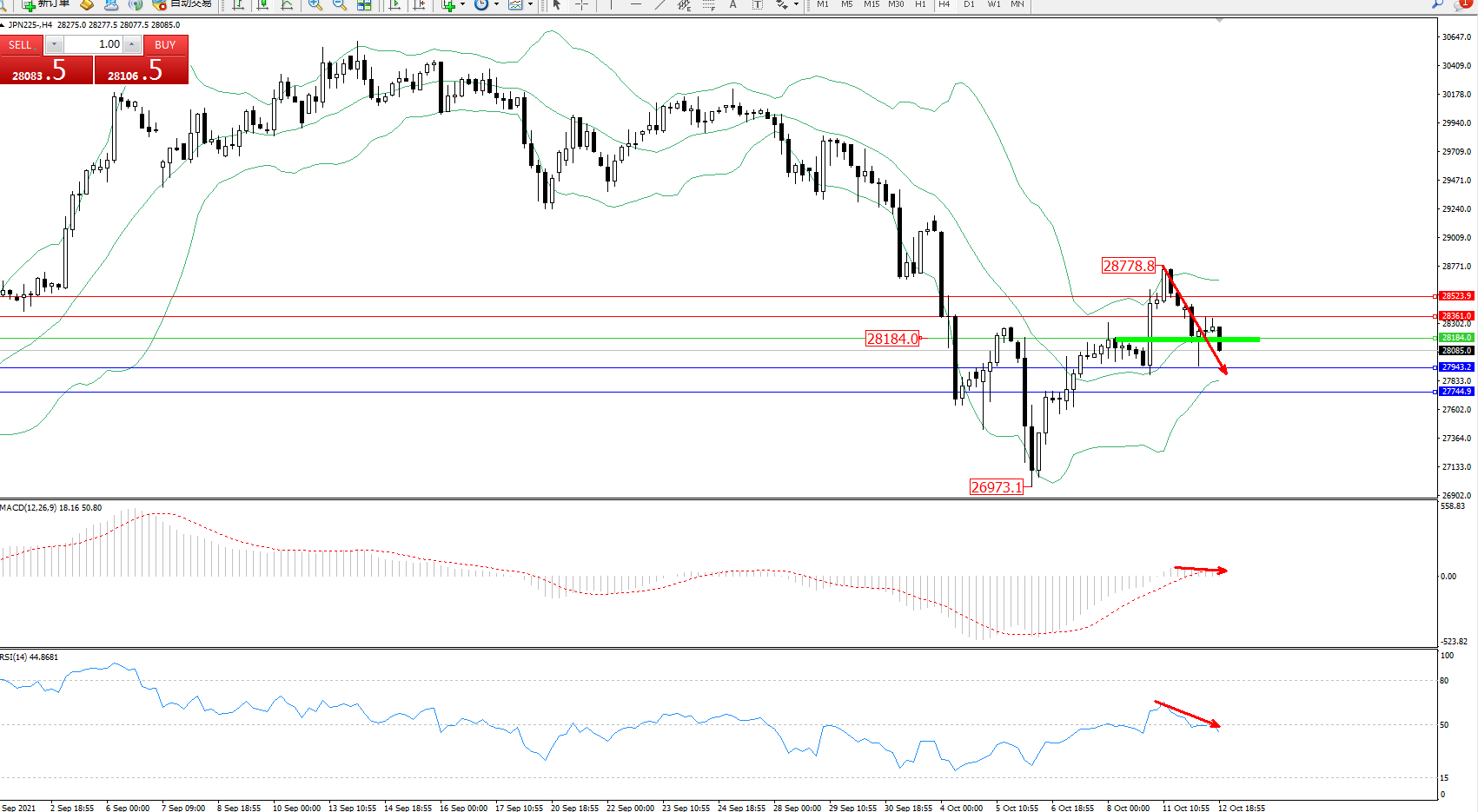技术点评:多头动力维持布林带指标通道中上轨区间持续震荡上扬,高位抵达28778位置后遇阻回撤,跌破布林带指标中轨附近节点后有进一步下行迹象,布林带指标呈收口走势持续平移中,MACD指标处于0轴线上側弱势徘徊中,RSI指标处于50均衡线附近持续整理中;