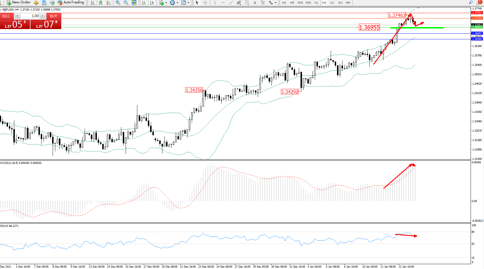 交易策略:1.36955上方看涨,目标1.37332、1.37551