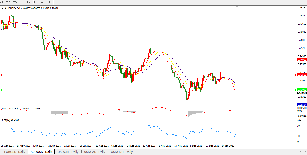 技术面简析:日图均线呈空头排列,汇价止跌后直线拉升,MACD运行于0轴下但量能小幅缩量,RSI快速走升,预计汇价大概率将在反弹后进一步下行。