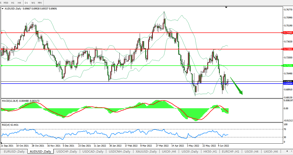 日线图看:短期汇价整理与中下轨之间汇价宽幅整理多次试反弹无果布林带指标呈开口走势下行中,MACD运行于0轴下方且量能开始放量,RSI迅速走弱,预计汇价大概率将在反弹后进一步下行。