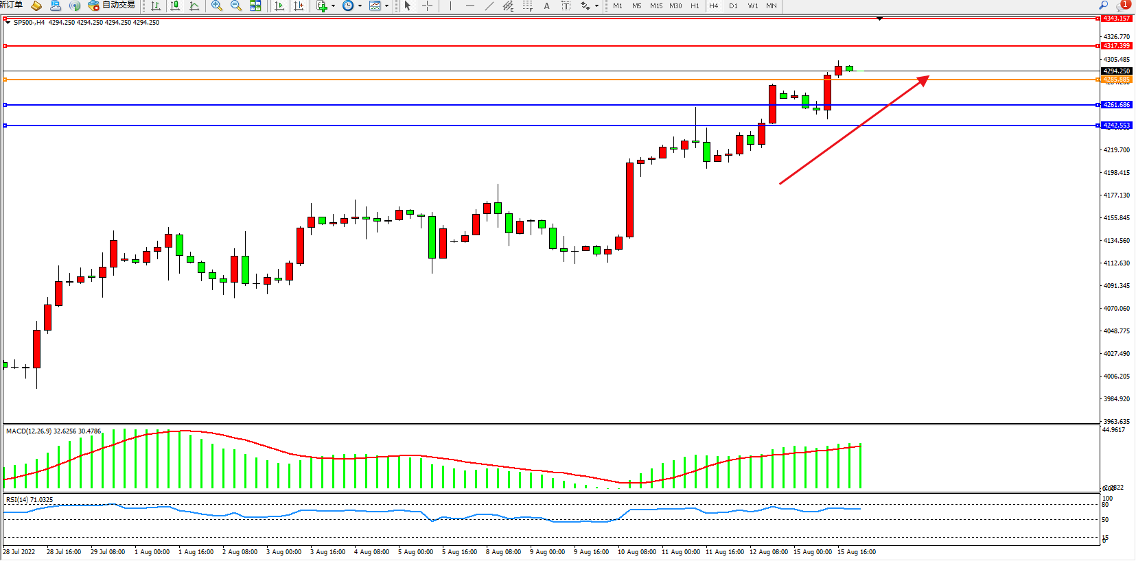 标普SP500——4小时K线图显示: