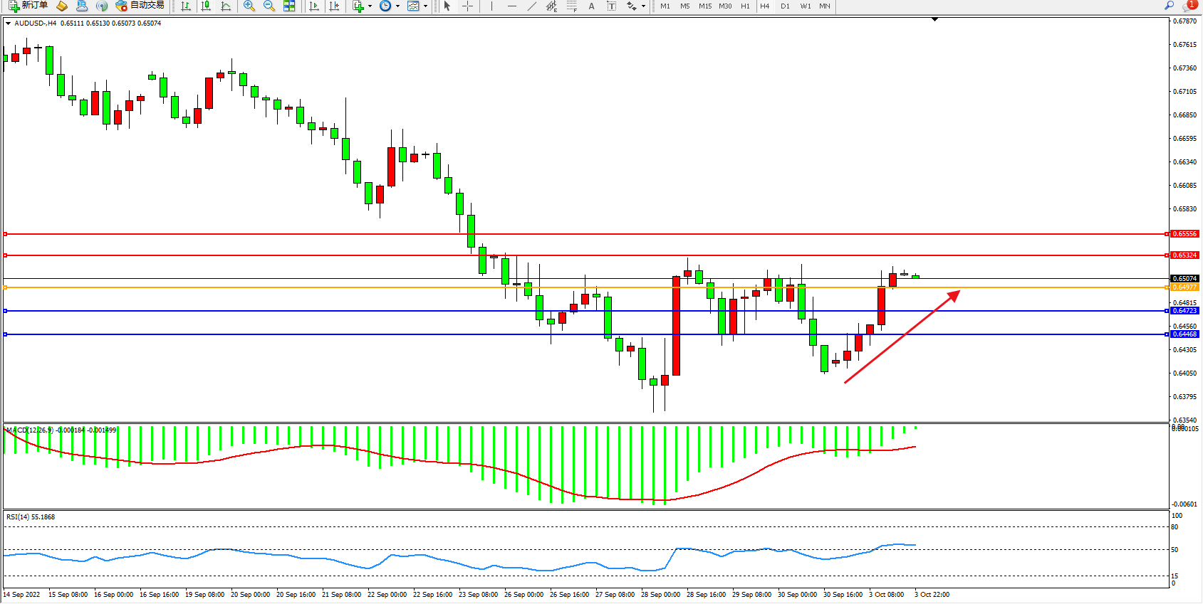 澳元美元AUDUSD——4小时K线图显示: