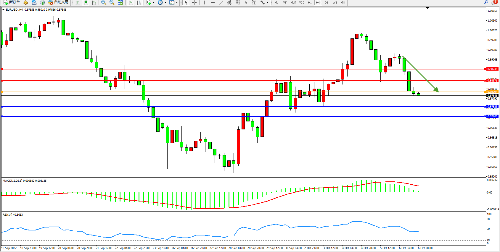交易策略:0.98004下方看跌,目标0.97523、0.97205