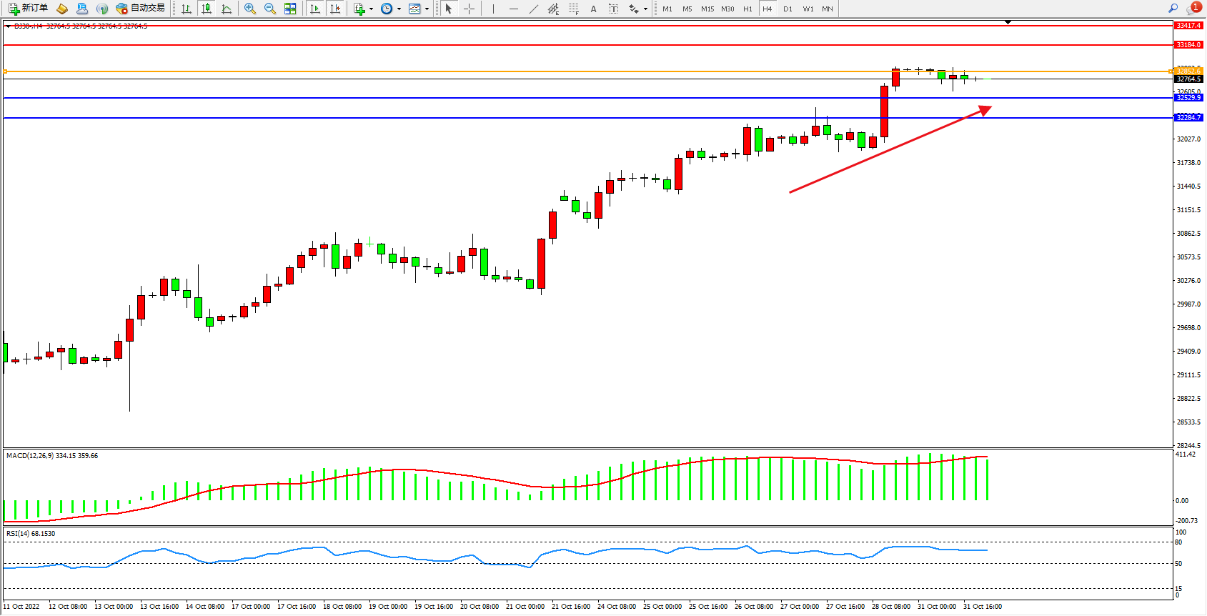道琼斯指数DJ30——4小时K线图显示: