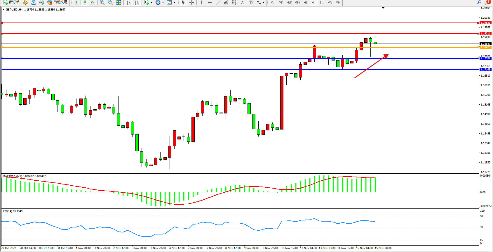 4小时图看:多头动力延续上行趋势持续震荡上移,短期看涨情绪涌现,市场多头强势上行后遇阻震荡,MACD指标处于多头区域高位整理,RSI指标处于多头区域徘徊;