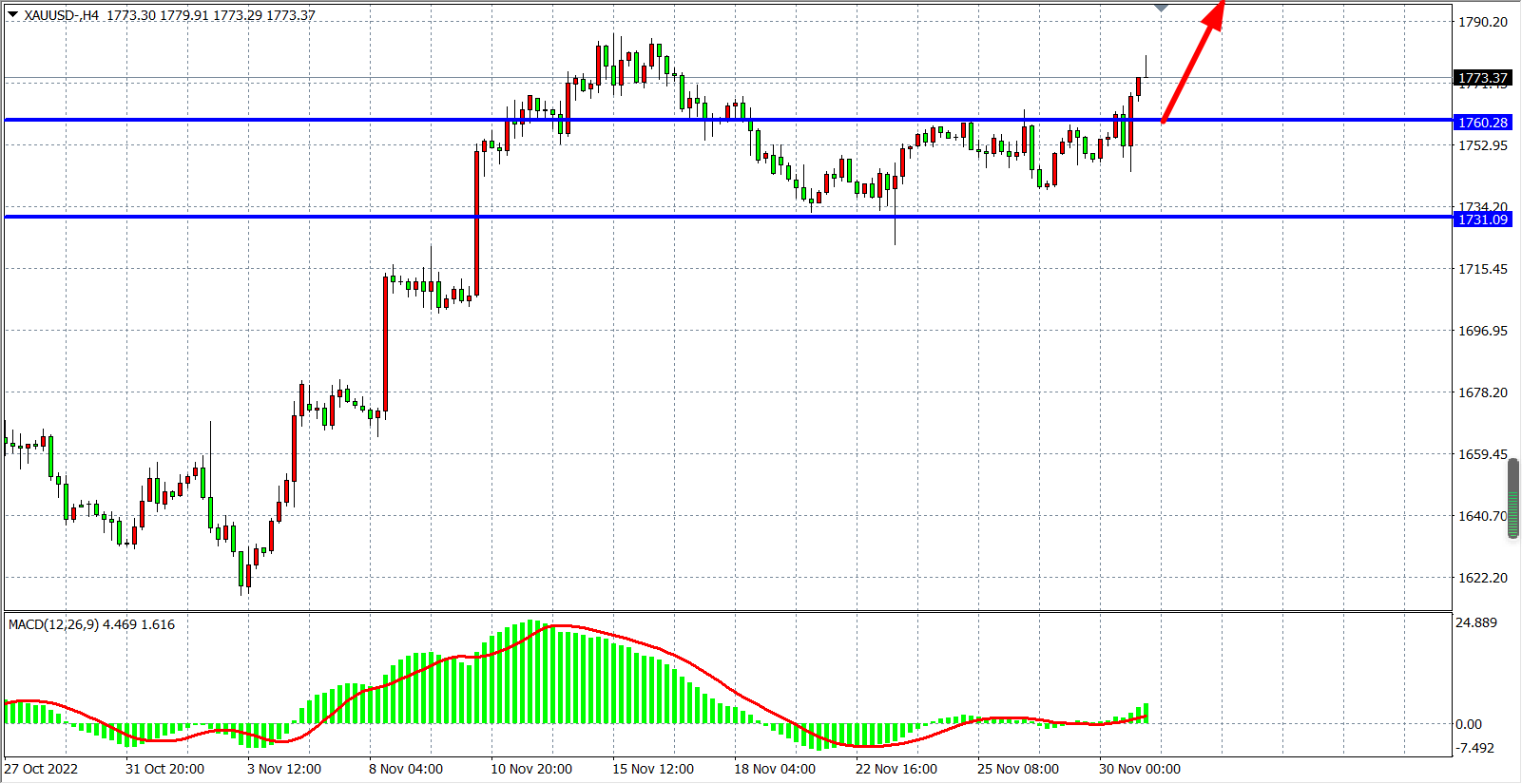 4小时图看,金价强势上涨破位1760阻力,当前阻力已转化为支撑,同时MACD在零轴之上开始放量,显示行情有望进一步走高,日内在1760之上可继续看涨为主,上方目标1785-1800。