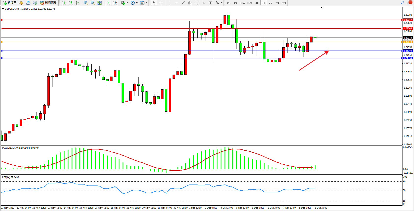 交易策略:1.22173上方看涨,目标1.22768、1.23147
