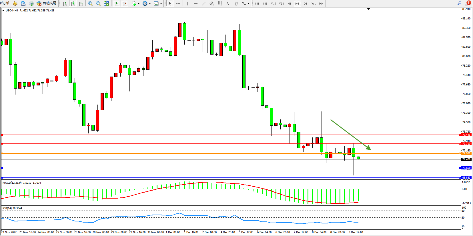 交易策略:71.902下方看跌,目标70.690、69.883
