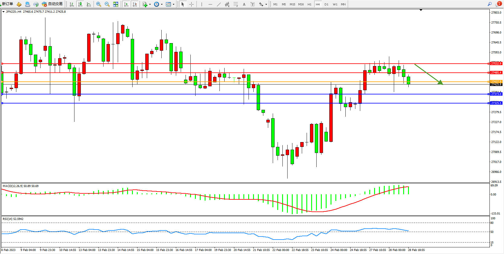 日经225指数2月28日(周二)收盘上涨1.54点,涨幅0.01%,报27425.50点。日本1月工业生产创八个月最大降幅,因海外需求下降对汽车和半导体设备等关键行业造成严重冲击。