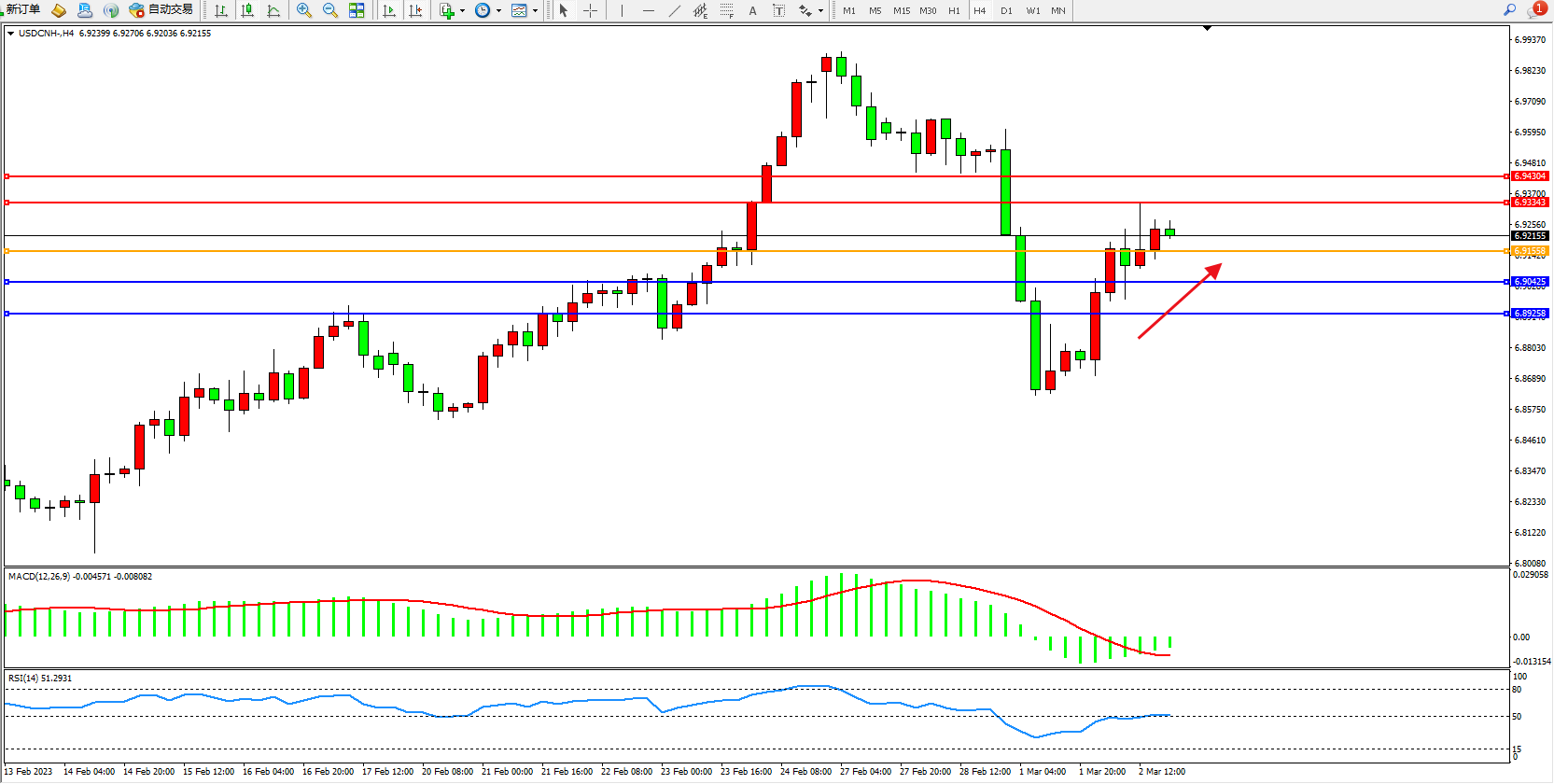 交易策略:6.91558上方看涨,目标6.93343、6.94304