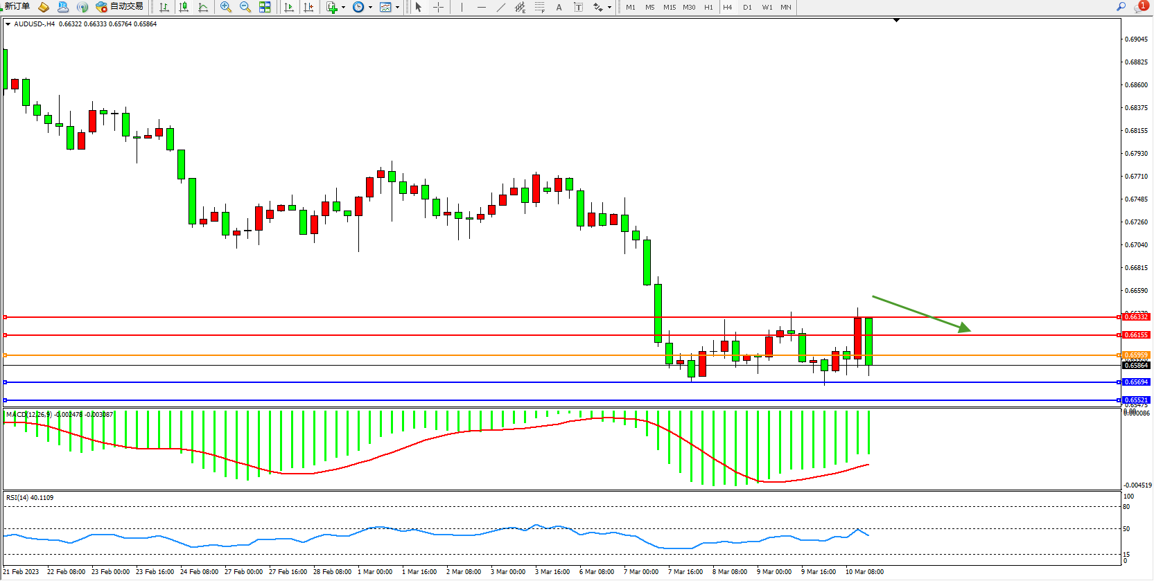 澳元美元AUDUSD——4小时K线图显示: