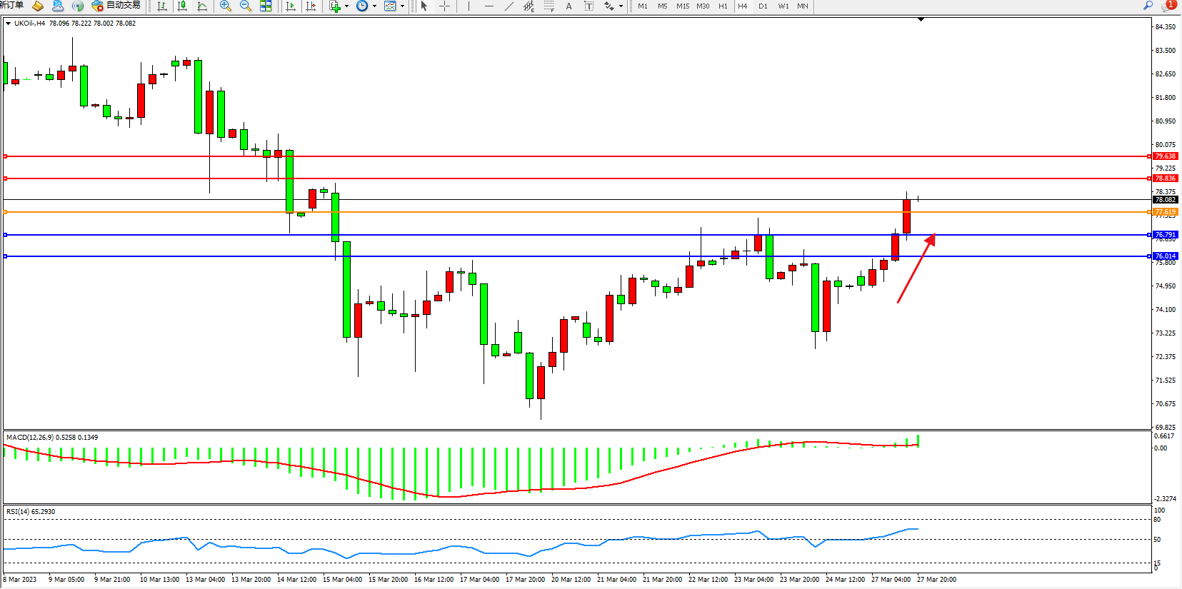 交易策略:77.619上方看涨,目标78.836 79.638
