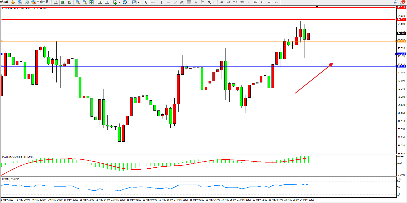 交易策略:73.829上方看涨,目标74.791  75.318