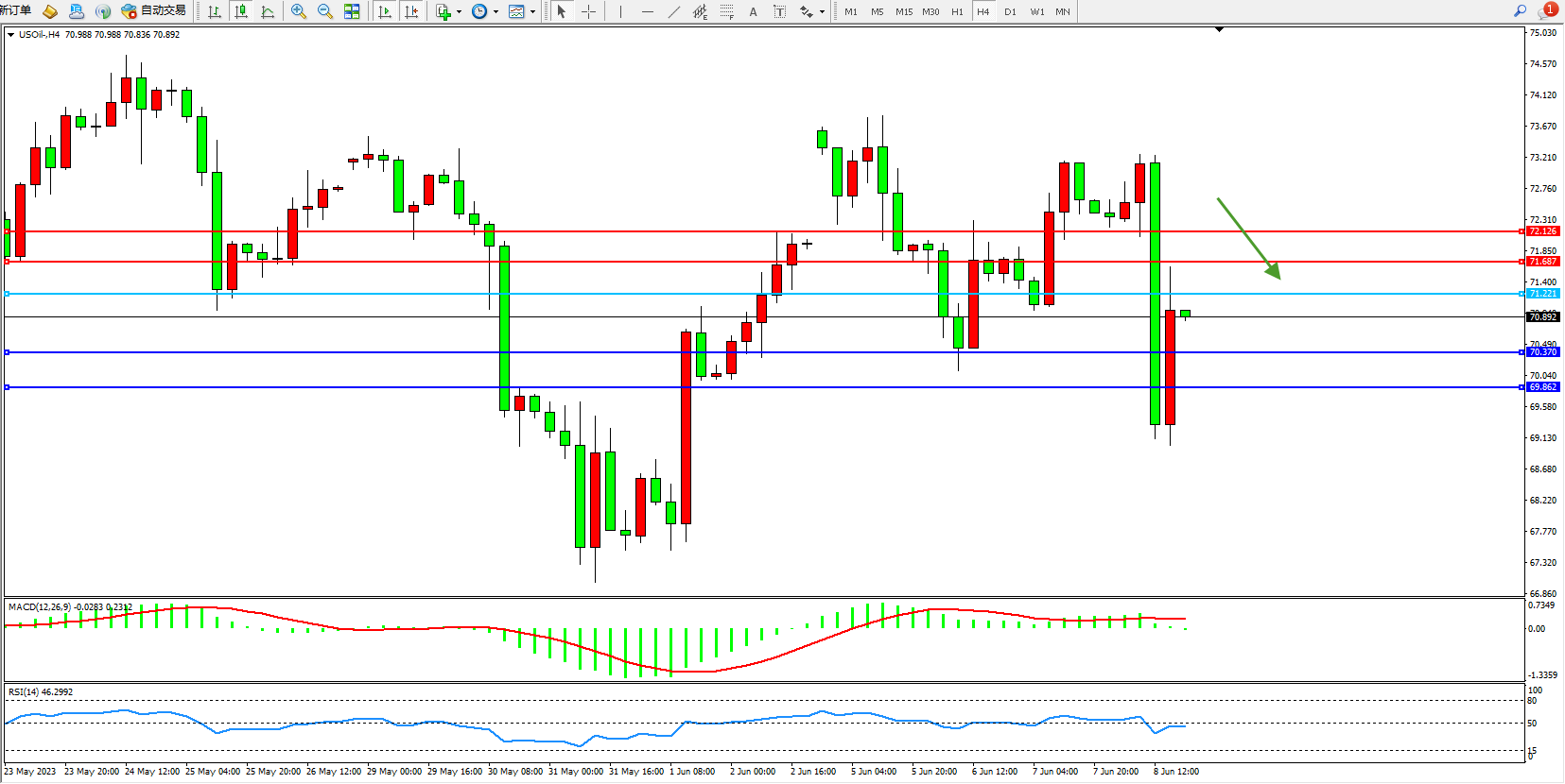 交易策略:71.221下方看跌,目标70.370  69.862