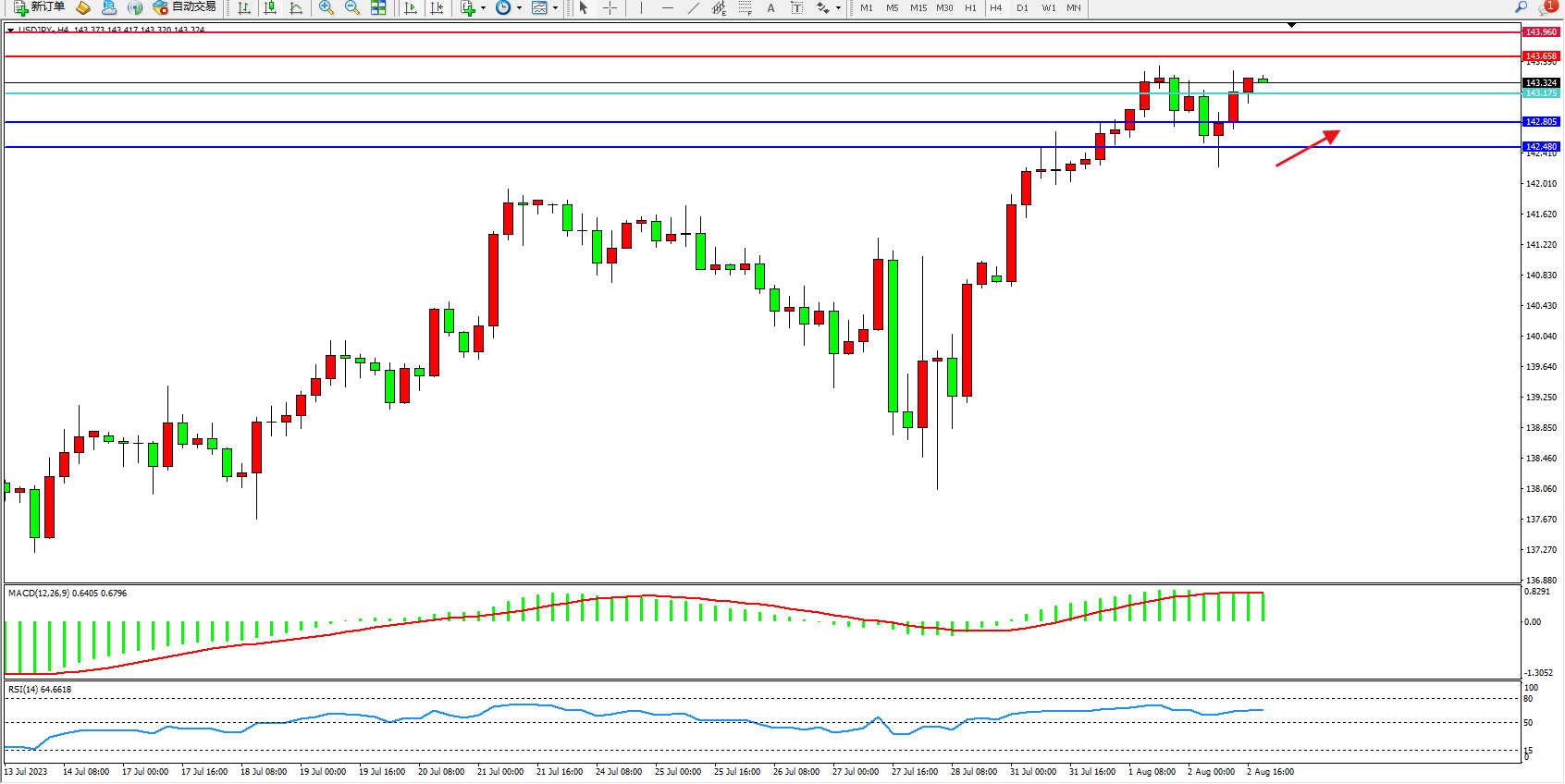 交易策略:143.175上方看涨,目标143.658 143.960