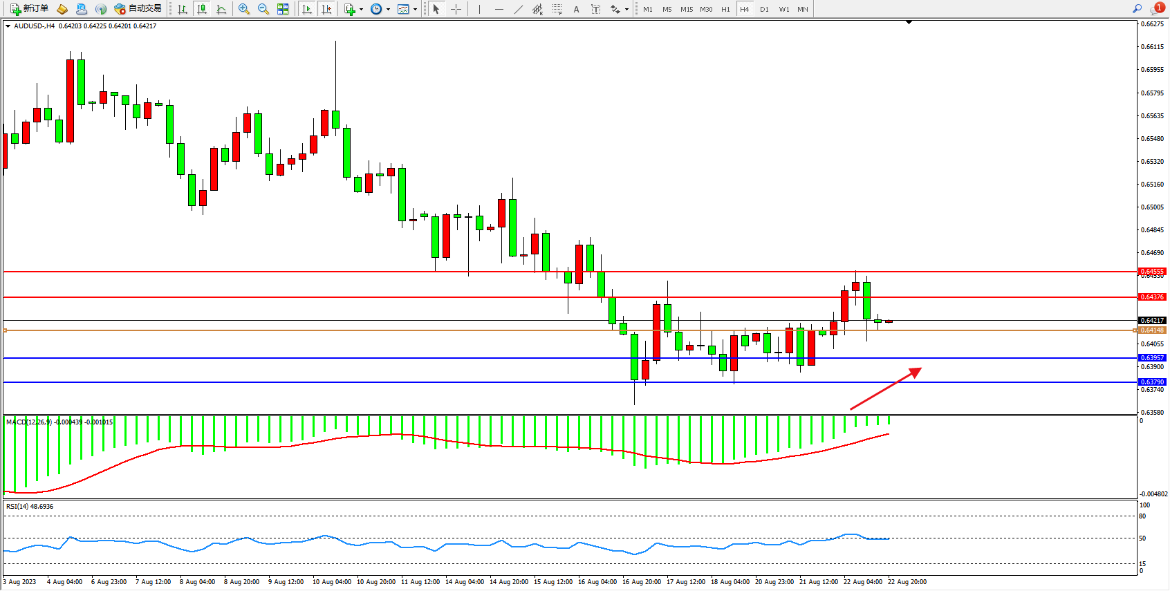 交易策略:0.64148上方看涨,目标0.64376  0.64555