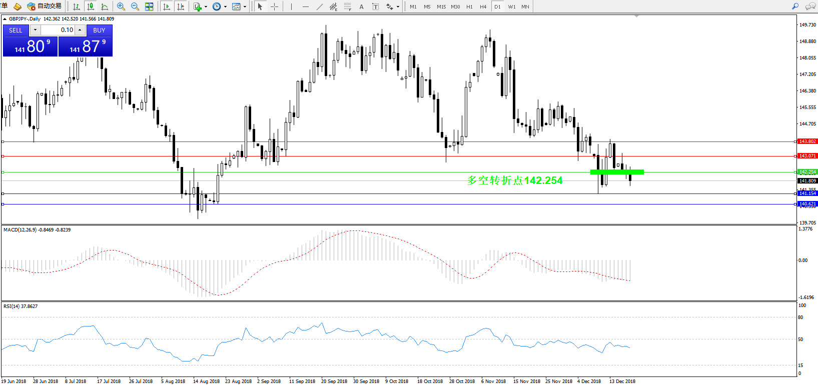 交易策略:142.254下方看跌,目标141.154、140.621