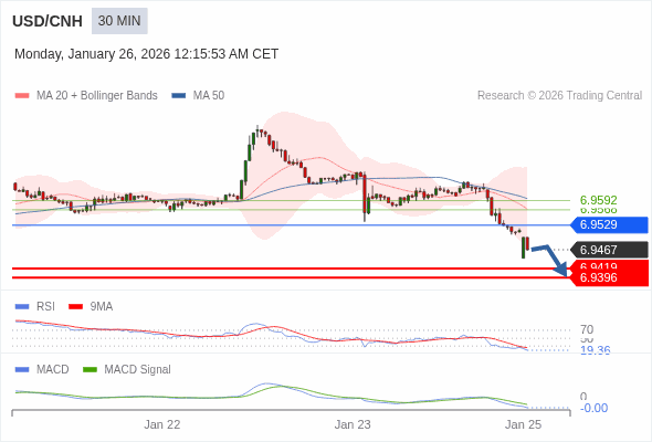 技术点评: RSI技术指标小于30。在这种情况下,说明有很强的下跌趋势,或者意味着处在超卖的状态下,可能会有向上的反弹。我们将观察RSI技术指标是否出现背离现象。 MACD技术指标处在其信号线之下看空。 配置为负。 此外,价位低于其20天及50天移动平均线 ( 分别位于6.9570 和6.9597 )。