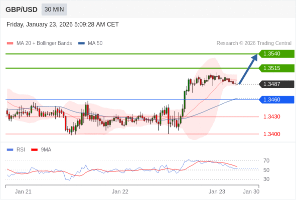 英镑/美元 当日内: 在1.3460之上,看涨。