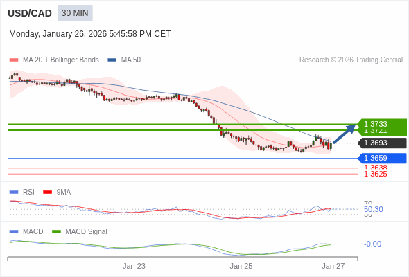 美元/加元 当日内 : 看涨。