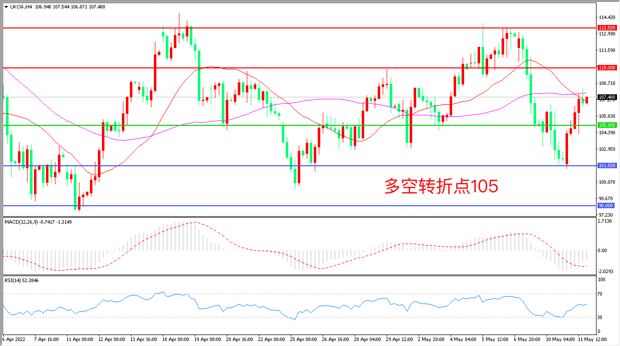4小时图看,油价回踩105美元后连续反弹,短期走势回暖,均线系统走平,MACD绿柱缩短,RSI指标走平,日内震荡上行概率较大。