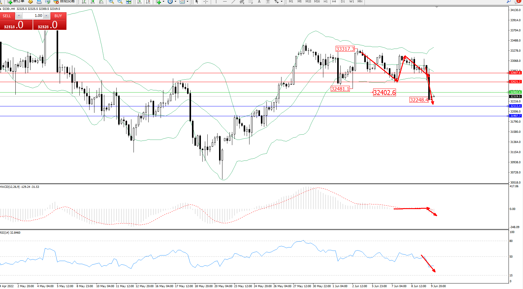 道琼斯指数DJ30——4小时K线图显示: