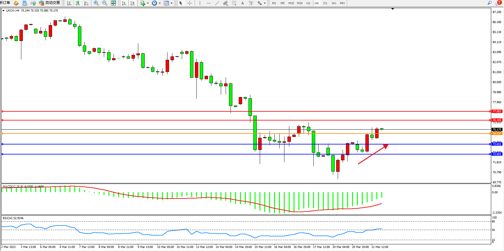 交易策略:74.737上方看涨,目标76.102  77.002