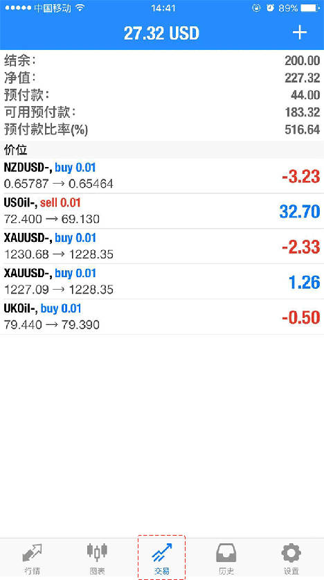 1.点击菜单栏的“交易”图标,将进入到交易页面。页面上方显示账户信息,下方显示未平仓的交易订单。